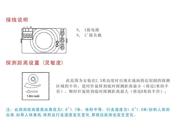 2>當(dāng)人進(jìn)入感應(yīng)探測范圍內(nèi),負(fù)載燈具已經(jīng)點亮后,如人一直停留在感應(yīng)探測范圍內(nèi),在設(shè)定的延遲時間倒計時結(jié)束前,只要人有輕微的移動(包括肢體的運動),感應(yīng)器將驅(qū)動負(fù)載燈具持續(xù)點亮,直至人離開且設(shè)定時間倒計時結(jié)束后,負(fù)載燈具自動熄滅。